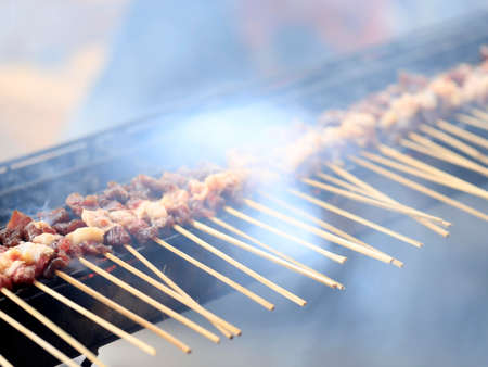 Chicken satay skewer on bbq coal grill.