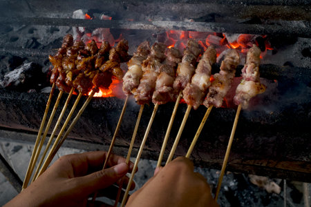 close up of sate ayam traditional culinary of chiken satay skewer being grilled using charcoal