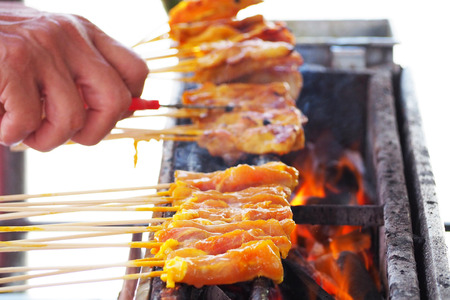 Grilled chicken sauce is a Thai barbeque food by chicken and sauce cooking on charcoal with flames at Thai street food market