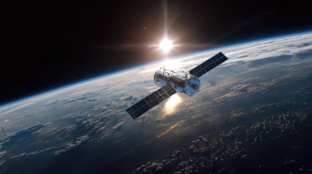 A satellite is depicted in orbit around Earth, illuminated by bright sunlight. The image showcases a metallic structure against the backdrop of the planet and the darkness of space. The composition is a high-angle view, and is suitable for various commercial or editorial applications related to space exploration and technology.