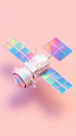 A vibrant and detailed illustration of a satellite, showcasing its solar panels and intricate design against a soft pink background.
