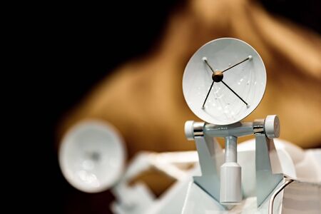 White rotating satellite dish antenna, VSAT parabolic receiver using to receive or transmit information at telecommunication exhibition. Broadcasting, communication, technology concept