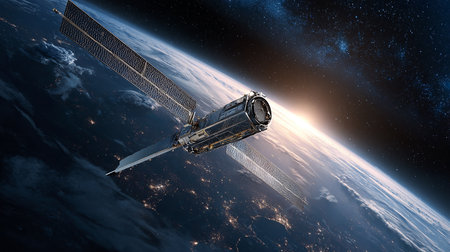 A satellite, equipped with solar panels, is depicted in orbit around a partially illuminated planet Earth. The image showcases the spacecraft's design and technological features, set against the backdrop of space. The scene employs a dark color palette, with hints of blue, and is suitable for various applications related to science, technology, or communications.