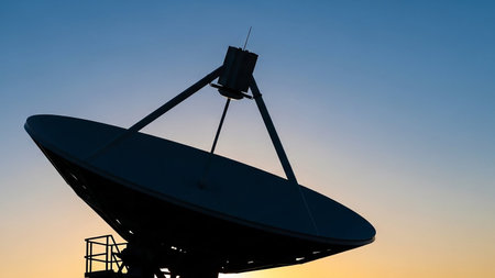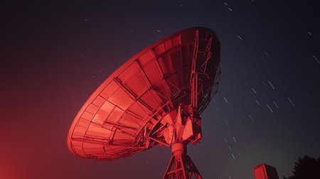 Satellite communication dish with night sky backdrop and digital signal effects