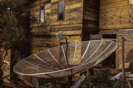 Homemade satellite dish on the background of a rustic wooden house in the tropics