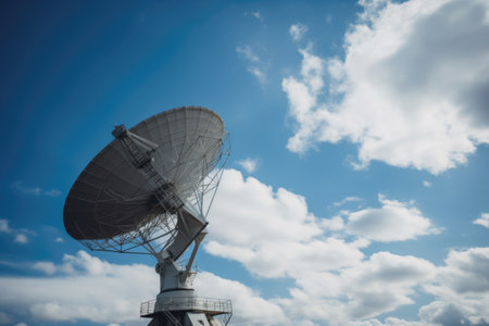 close-up of satellite dish, with the blue sky and clouds visible in the background, created with generative ai