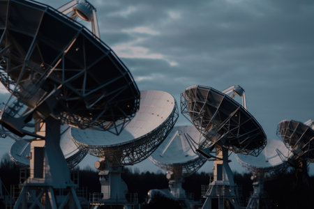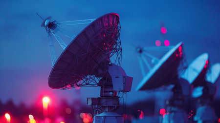 Large satellite antennas against a twilight sky, glowing with red lights, representing global communication networks.