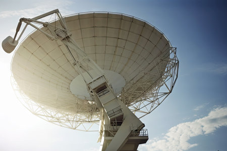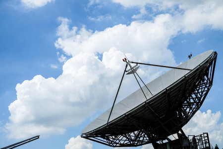 Large satellite dish pointed towards a blue sky with clouds