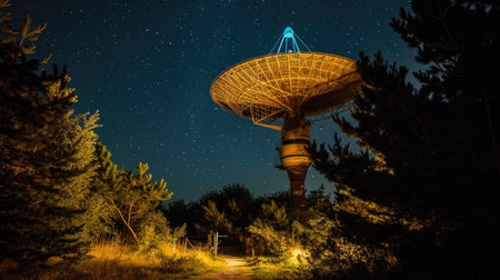 A large radio telescope stands tall under a starry sky, actively receiving signals from distant galaxies. The equipment's intricate design highlights human innovation in astronomy.