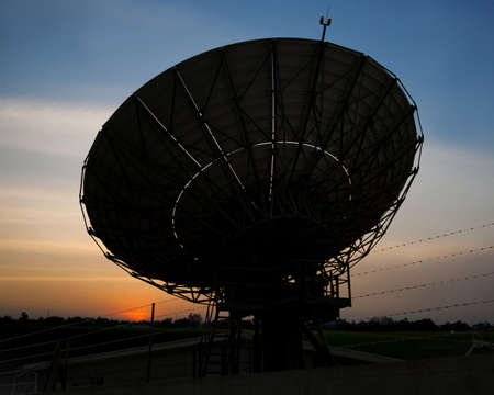 Silhouette of a large satellite dish against a colorful sunset sky. Clear details and vibrant colors enhance v...