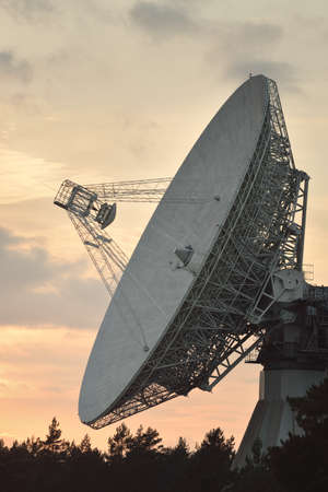 Large radio telescope. Dramatic sunset sky, glowing clouds. Nature, weather, science, equipment, technology, international security, communications, remote places