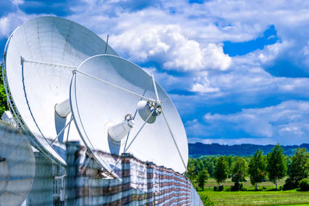 A field with large satellite antennas. The concept of communication with space.