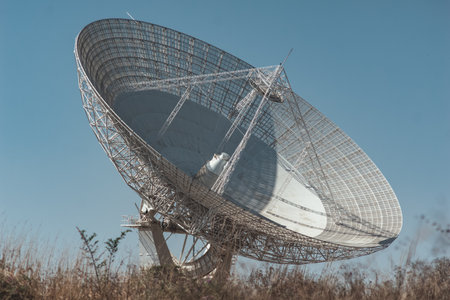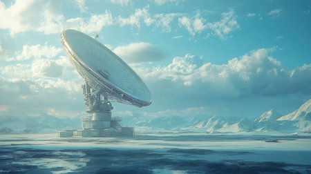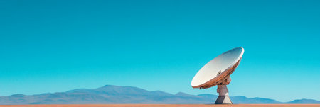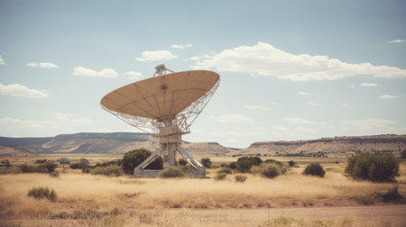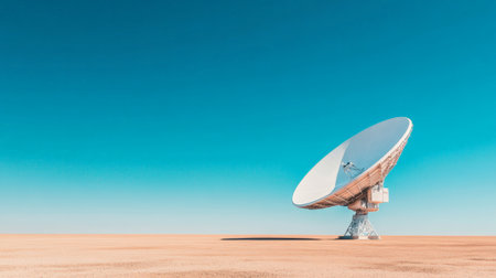 Giant satellite dish antenna exploring the universe under a clear blue sky in a vast, desolate desert landscape, searching for signals from distant galaxies and potentially extraterrestrial life