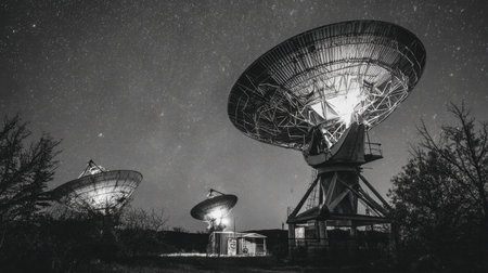 This captivating black and white image features three satellite dishes illuminated against a starry night sky, showcasing a serene landscape.