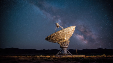 A stunning satellite dish stands illuminated under a brilliant starry sky, showcasing the magnificent Milky Way in the backdrop. This serene desert scene captures the beauty of technology and nature intertwined at night.