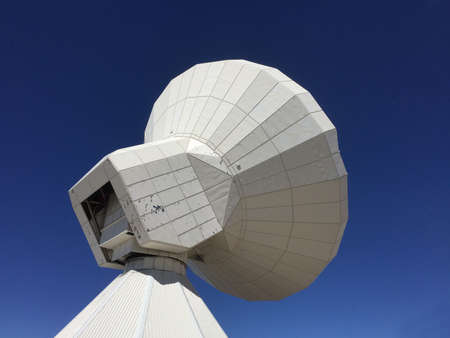 Huge white antenna radio telescope on blue sky background on top of the mountain natural daylight