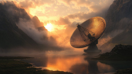 A massive satellite dish reflecting the rays of the rising sun, surrounded by mist-covered mountains.