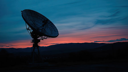 A satellite dish bathed in twilight hues, reflecting the last light of the sun before nightfall.