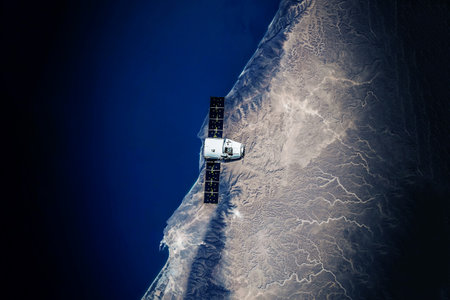 A satellite hovers high above a vast desert region, capturing the intricate patterns of the terrain below.