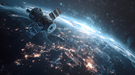Space satellite orbiting Earth with glowing city lights. Concept of space exploration, satellite technology, Earth observation, astronomy.