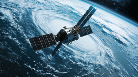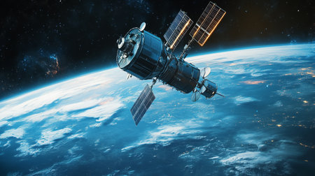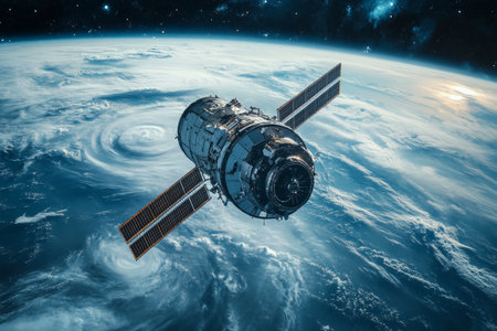 Satellite in Orbit Against Black Space, Capturing Earth’s Atmosphere and Clouds