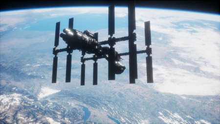 International space station closeup: Earth planet at spatial galaxy. Solar system concept about spacecraft at sun light background. 3D animation of orbit exploring. Soft light scenery illustration