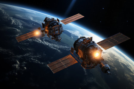 Two satellites are orbiting Earth, demonstrating the integration of technology in space exploration and research.