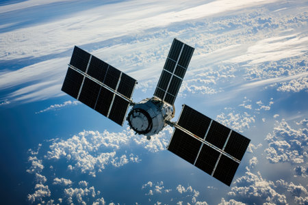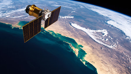 A satellite orbits Earth, with clouds in the backdrop, highlighting technological advancement.