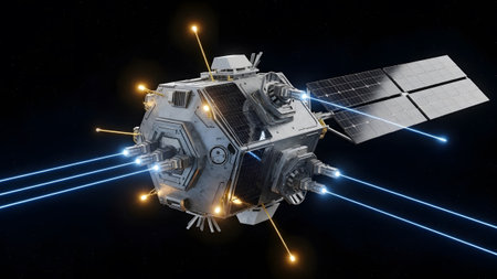 High-tech space satellite transmitting data with radiant blue beams across the vast dark cosmos