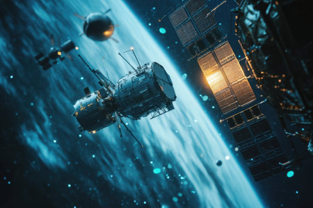 Realistic capture of two small space stations orbiting earth with glowing solar panels and stars