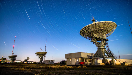 Under a celestial canvas streaked with the motion of distant stars, a trio of powerful radio telescopes stands silent vigil. These technological giants listen intently to the faint whispers of the cosmos, searching for signals and data from across the universe, bridging the vastness of space with human curiosity.