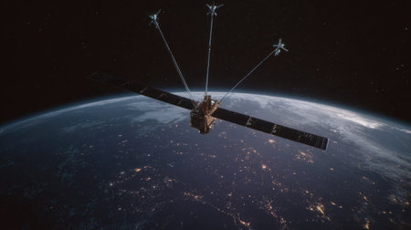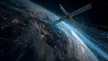 Satellite orbiting Earth transmits data related to GPS and positioning for global navigation systems. Generative AI