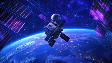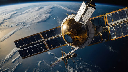 A state-of-the-art communication satellite with large solar panels orbiting the Earth in the vastness of space, demonstrating cutting-edge space technology on a sunny day..