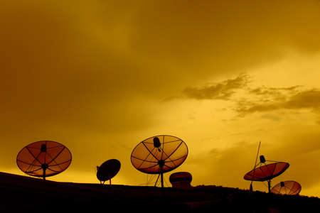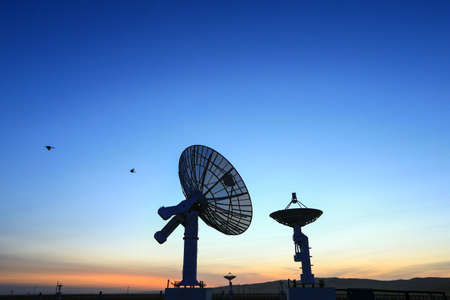 A striking scene featuring a silhouette of satellite dishes facing a colorful sunset sky, showcasing the blend of technology and nature's beauty in the evening.