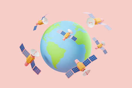 Satellites orbiting earth globe on pink background. Concept of technology and web. 3D rendering