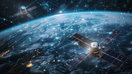 A captivating digital render showing space satellites orbiting Earth, illustrating technology's connection with our planet's illuminated cities at night.