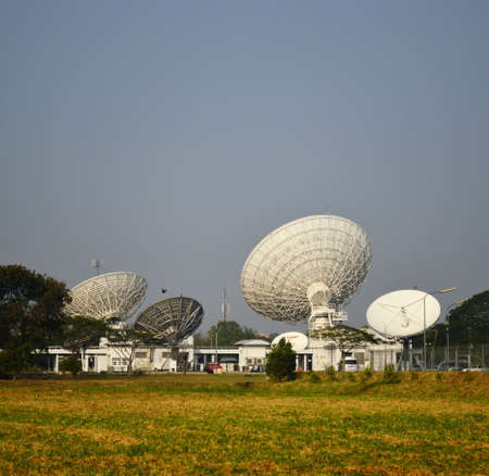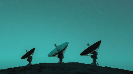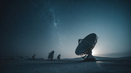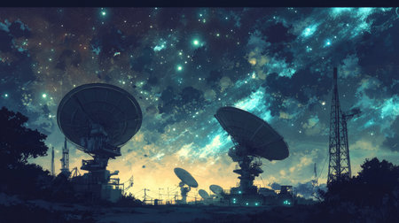 Large satellite dishes scan the universe for signals and explore the cosmos under a breathtaking starry night sky. Searching for extraterrestrial life and expanding our understanding of the universe