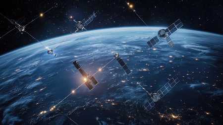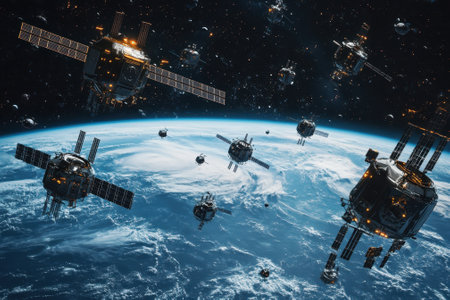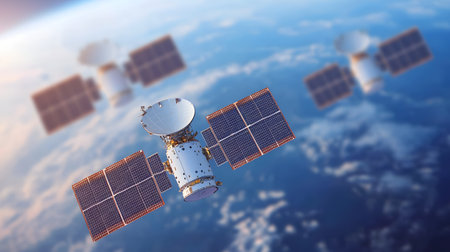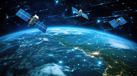Multiple satellites are orbiting Earth, showing their solar panels and intricate designs against a backdrop of space.