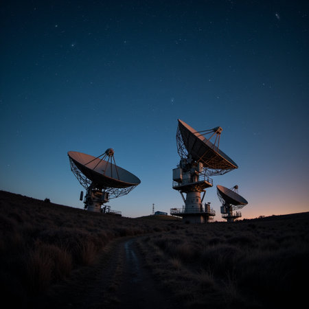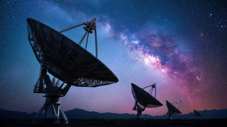 Radio telescopes against a backdrop of the Milky Way galaxy, highlighting exploration and technology.