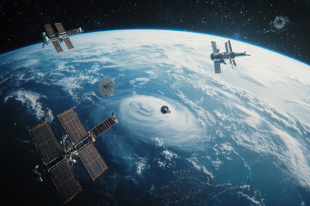 Stunning view of earth from space with orbiting satellites and cosmic background details