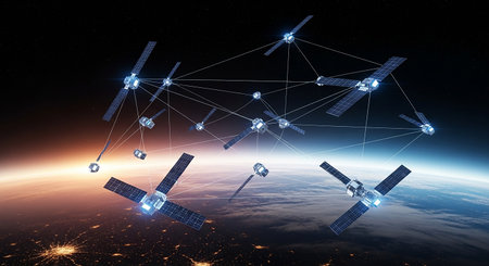 A cluster of satellites float majestically above the Earth, showcasing advanced technology in communication. The background presents a blurred celestial scene, enhancing the high-tech atmosphere.
