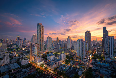 Aerial view of Bangkok cityscape at sunset with skyscrapers in Thailand