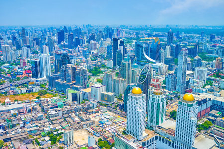 BANGKOK, THAILAND - APRIL 24, 2019: The business district of Bangkok boasts numerous skyscrapers with amazing design, making unique face of modern city , on April 24 in Bangkok
