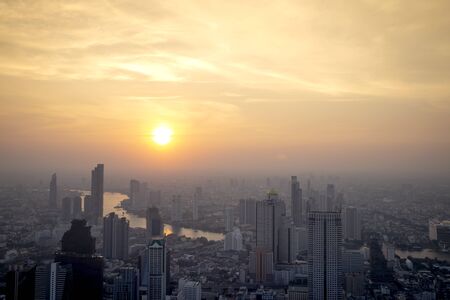 Aerial view of Bangkok and Chao Phraya river in evening haze on dusk