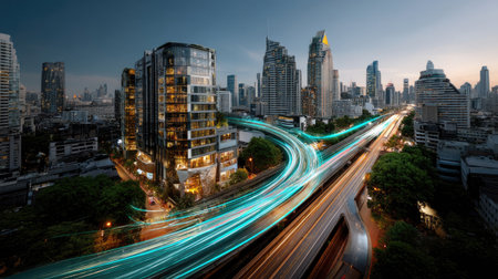 Stunning urban skyline captured at dusk, showcasing dynamic traffic light trails, modern architecture, and a vibrant city atmosphere.