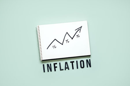 Inflation financial crisis concept. Growing up black arrow on open notepad and word Inflation on blue background. Rising cost of living.