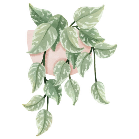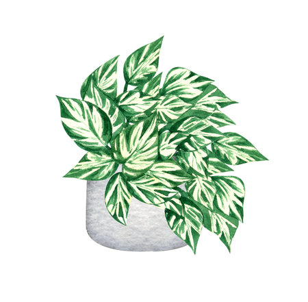Manjula pothos,, houseplant in the pot, isolated on white background. Watercolor potted plant illustration. Home decor