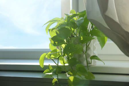 Golden pothos, scindapsus, epipremnum pictus. Houseplant in pot. Home flower. Isolated illustration with indoor plant. Cozy home