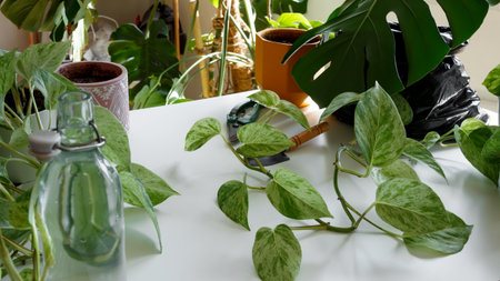 Plant rehabilitation. Table filled with houseplants and various plant care tools in a cozy indoor environment