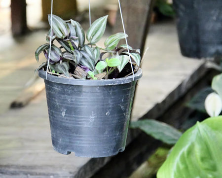 a photography of a potted plant hanging from a wooden porch, flowerpot hanging from a rope with a plant in it.